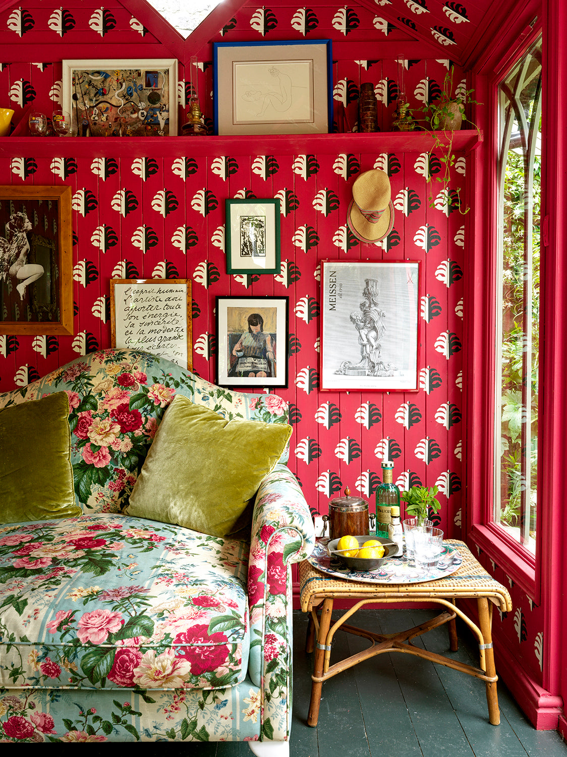 The small garden house is painted green to blend in with the landscaping, in stark contrast to its cherry interior (below).