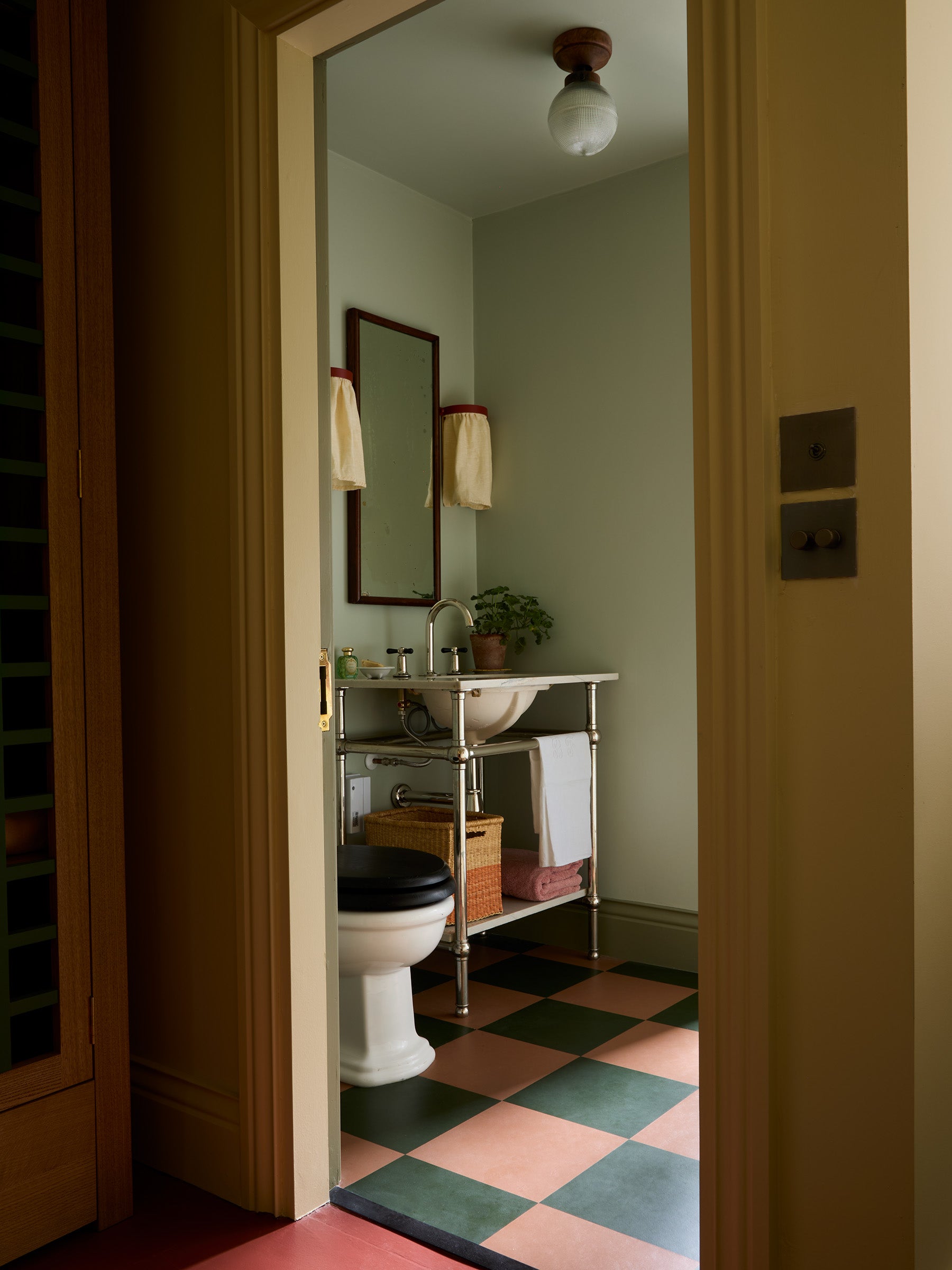 The guest room is drenched in sunny 'Butter', with a bathroom leading off it with a brown and green chequered lino floor.