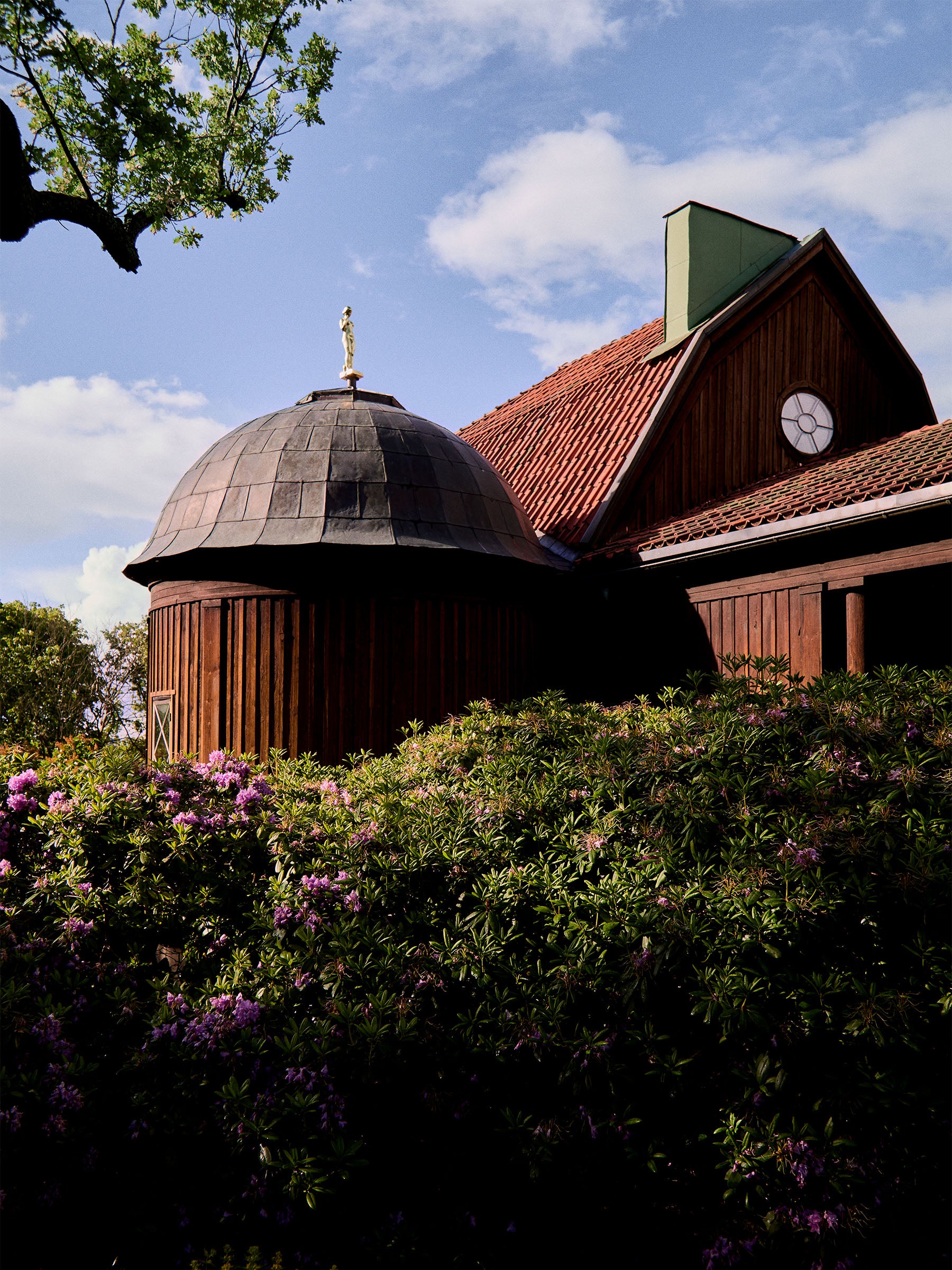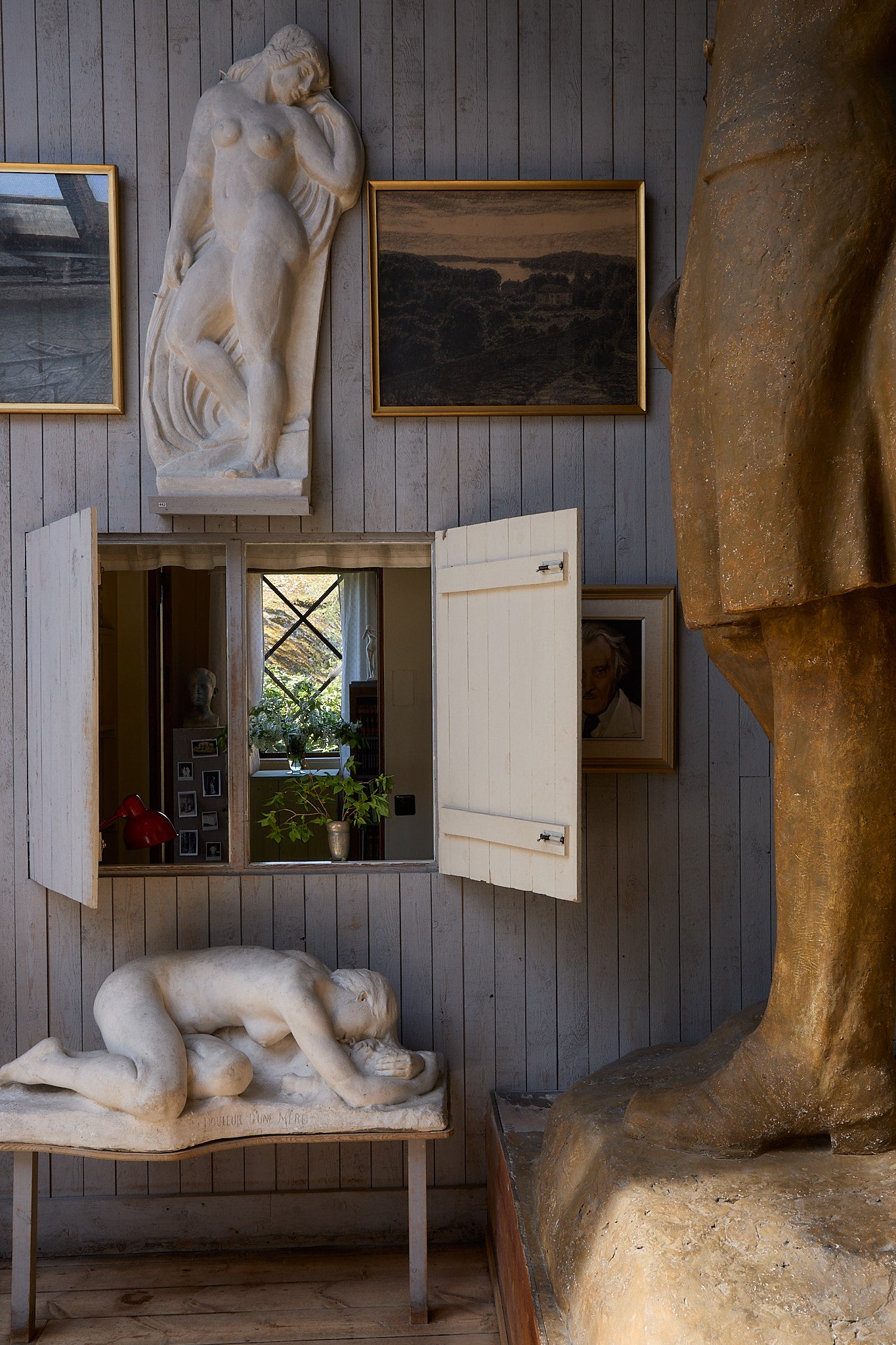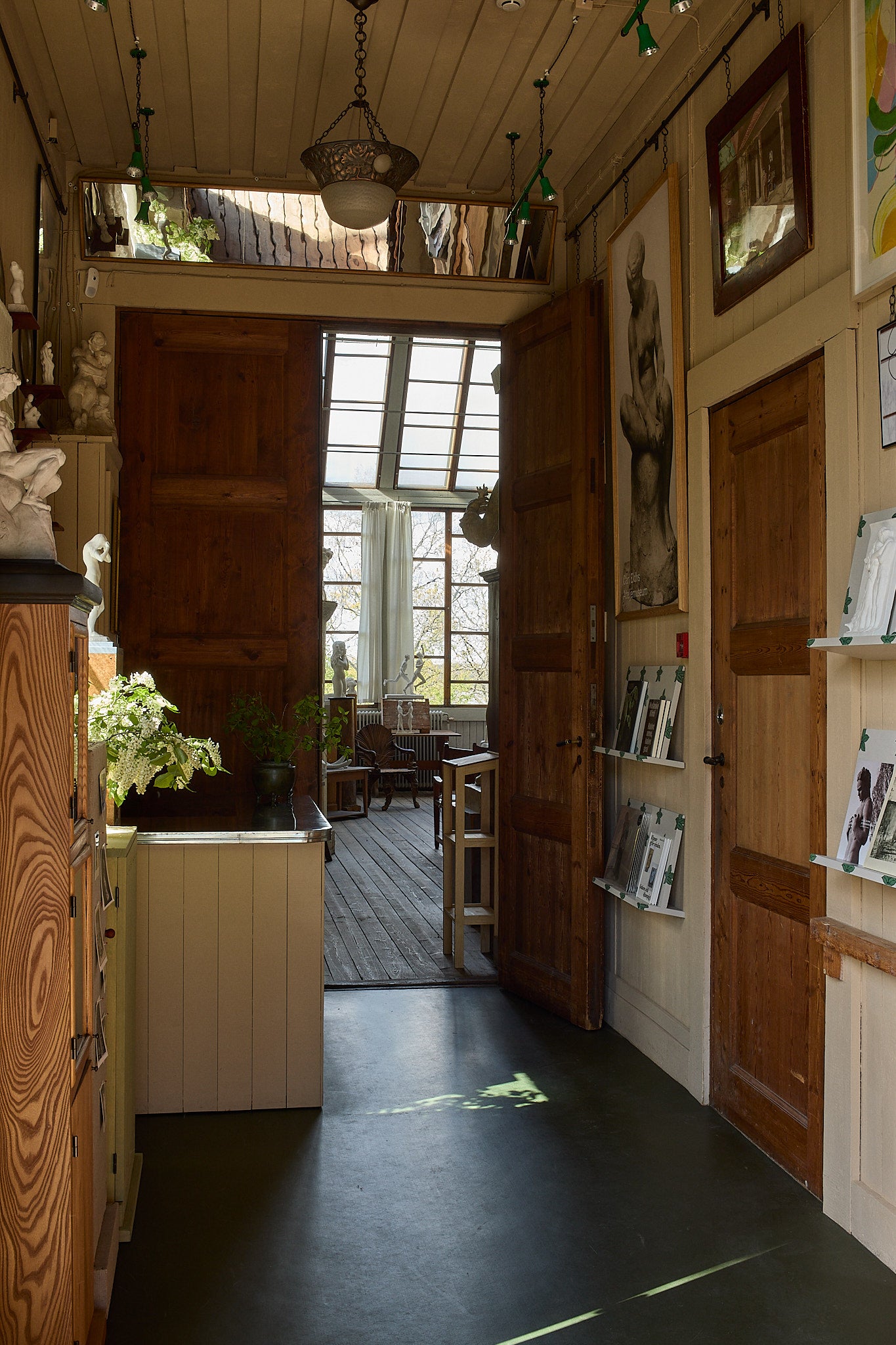 Rising from luscious greenery, the studio's aromatic tarred wooden façade is inspired by Stockholm's oldest stable next door. It might not appear so at first glance, but the building itself is a combination of wildly different points of reference masterfully pulled together by the preeminent Swedish Grace architect Ragnar Östberg. The entrance loggia looks a little like a Greek temple, the rotonda a mini Pantheon and the large studio like an old norse feasting hall. There is a sense of freedom and irreverence in this heady mix, tied together by a restrained colour palette but above all a natural understanding of the limitations of the place it is in. It's an expression of humble nordic classicism rooted in the local vernacular yet filled with imagination.