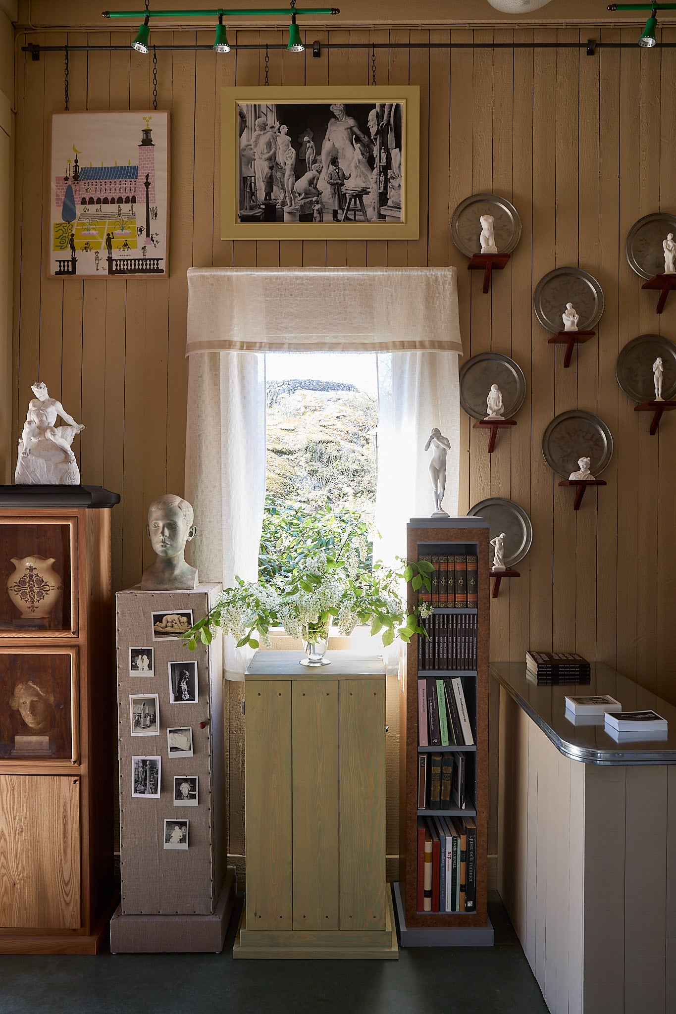 The first room a visitor enters is the shop we designed (above and below). The original painted walls remain in a dusky yellow. All other elements were added drawing inspiration from the studio's lively displays of Eldh's sculptures, maquettes and also sentimental objects he collected. To show off the smaller plaster casts available to buy in the shop we designed simple wall mounted shelves. These were decorated in oxblood red linseed oil paint and we sourced antique pewter plates which form a striking back drop for each chalky piece. The postcards on offer are casually pinned to the door of a canvas covered plinth. The ambition was for the room to feel layered and with lots of opportunity for change and evolution going forward. All materials are natural and solid avoiding unnecessary expense but used with creativity.