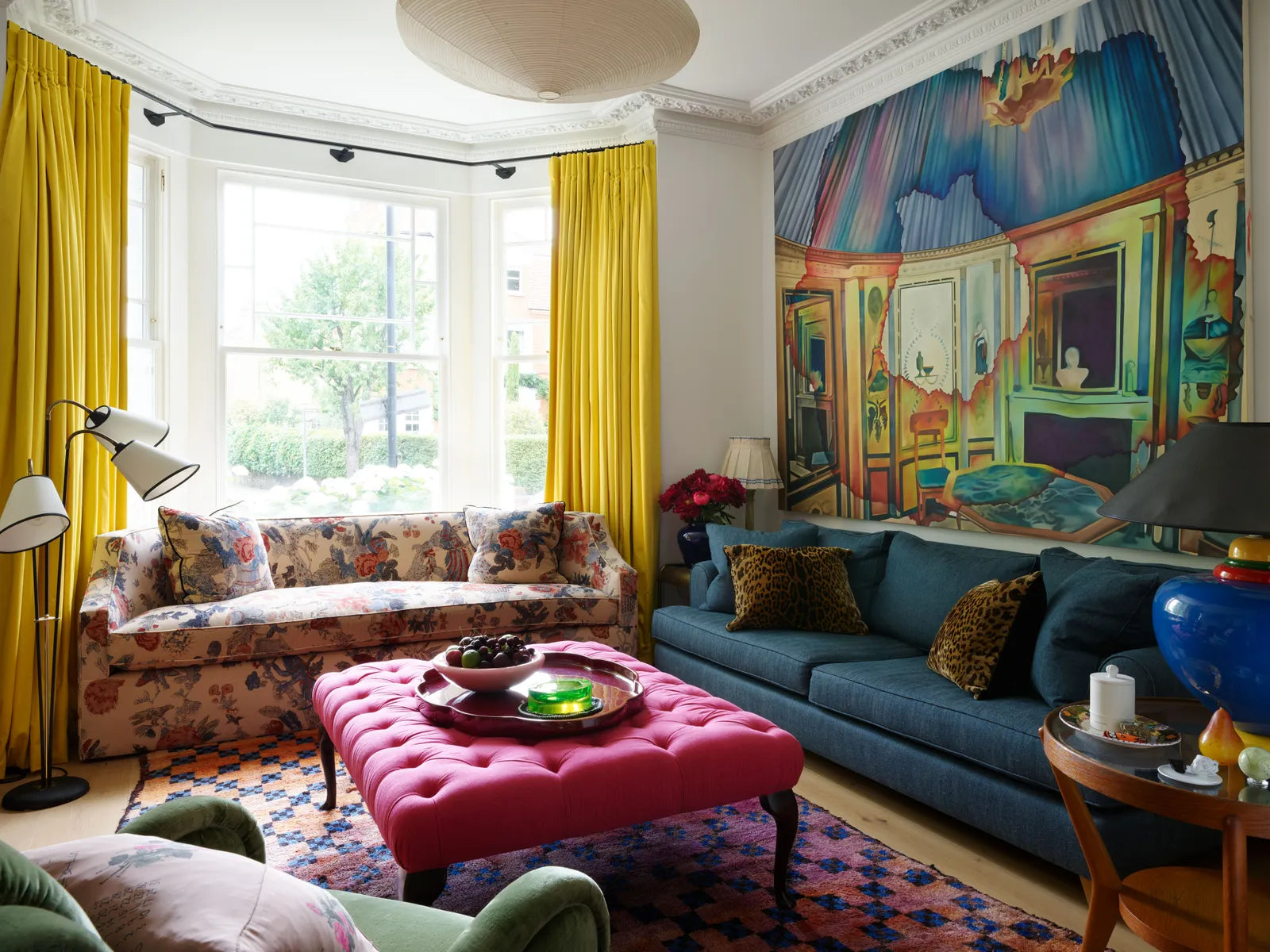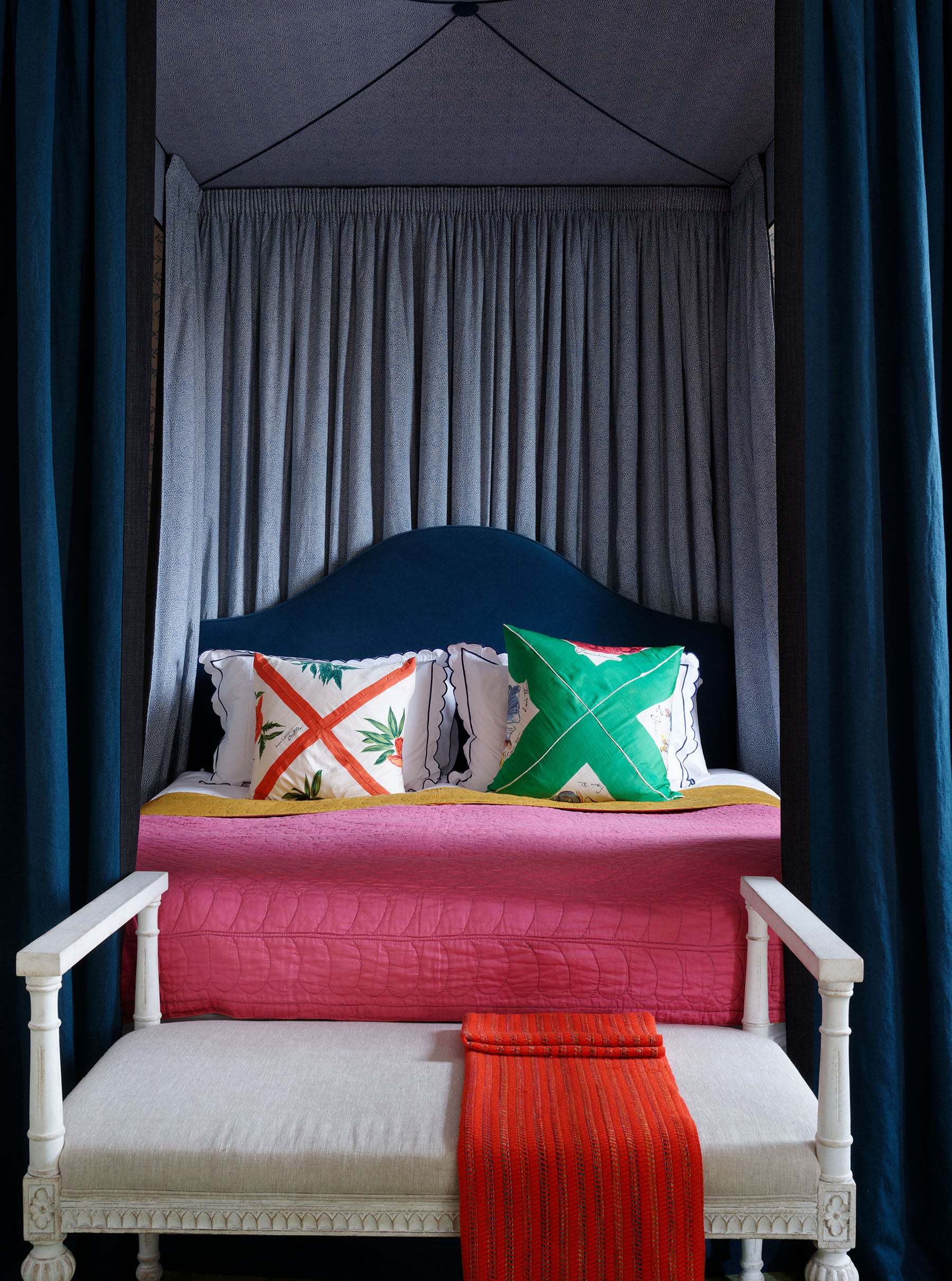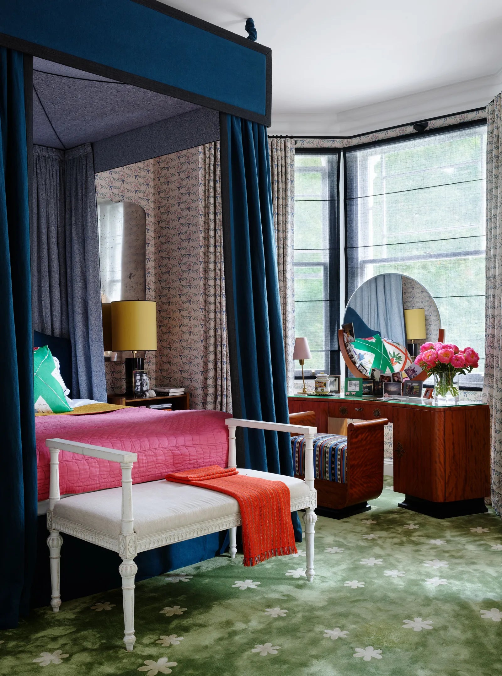 A huge tester bed dominates the main bedroom (below), covered in an inky linen on the outside and small leopard print on the inside. The nostalgic and somewhat sweet wallpaper with matching curtains is offset by the black sheer blinds and a luscious fitted carpet covered in stylised daisies which we designed bespoke.