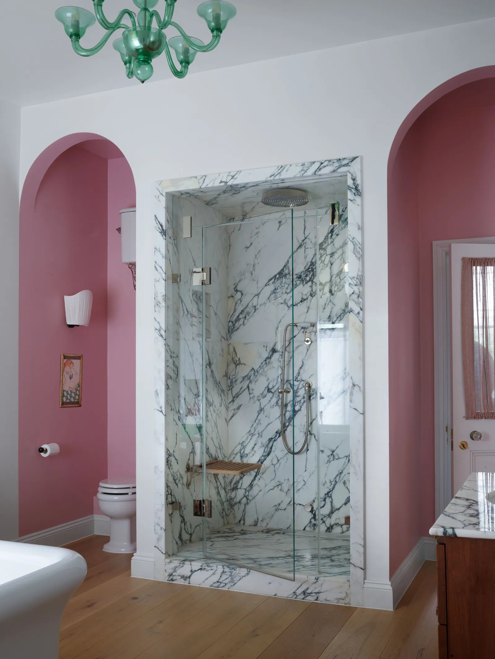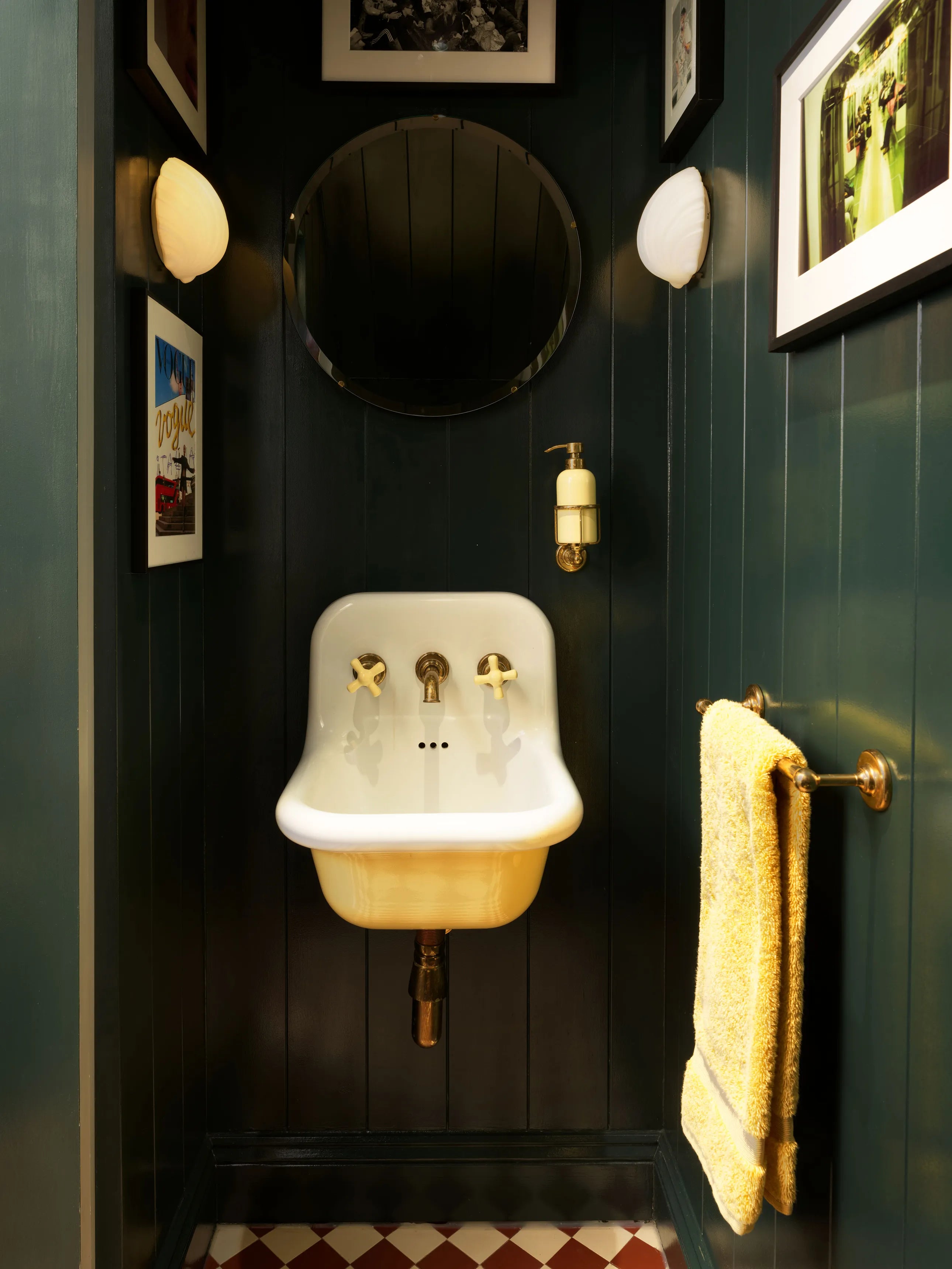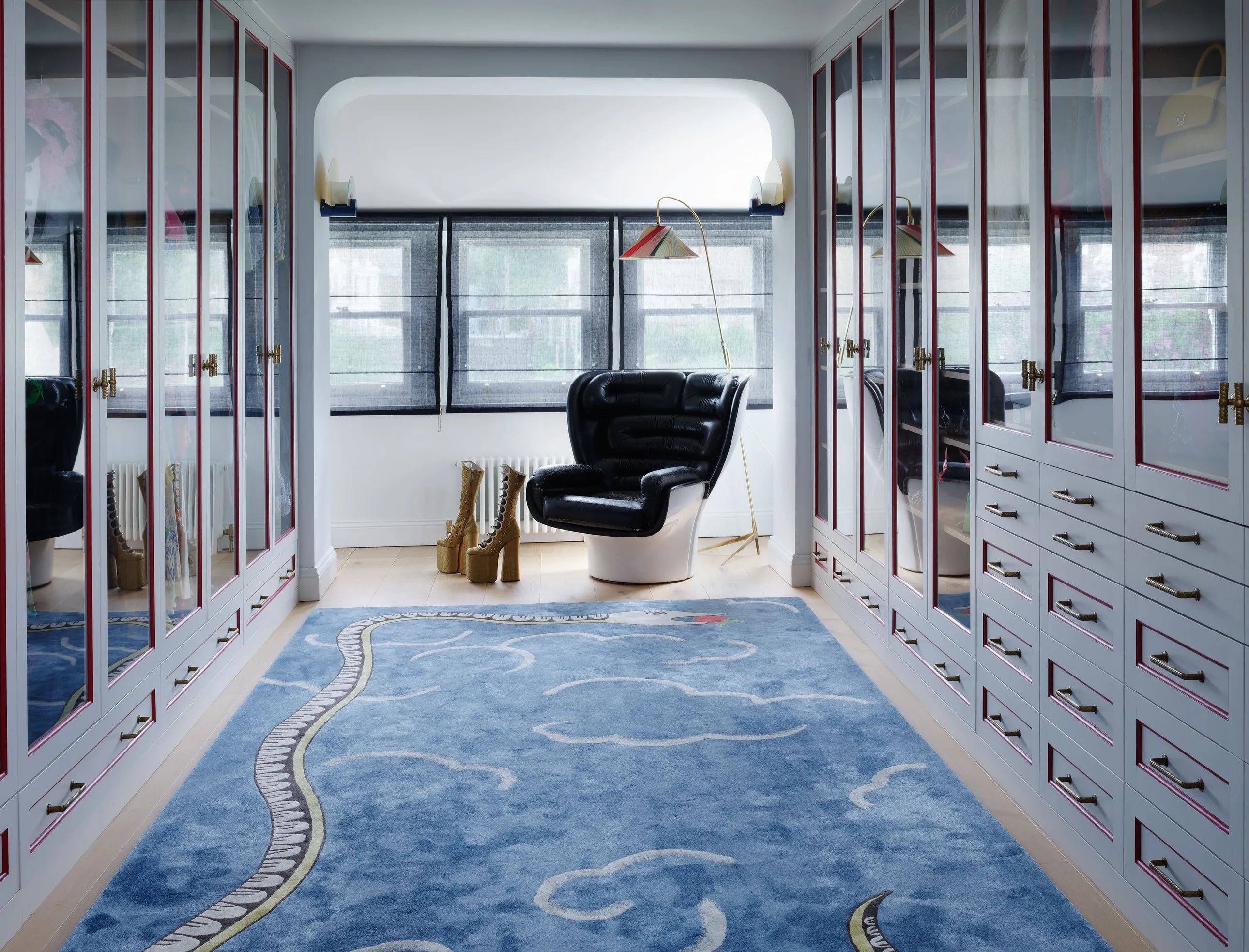 You can easily find what you are looking for through the glazed doors in the generous dressing room. The thin, pillar box red moulding framing each pane of glass was inspired by Wallis Simpson's design for Edward's painfully chic bathroom. Always lurking under foot is the sneaky serpent.