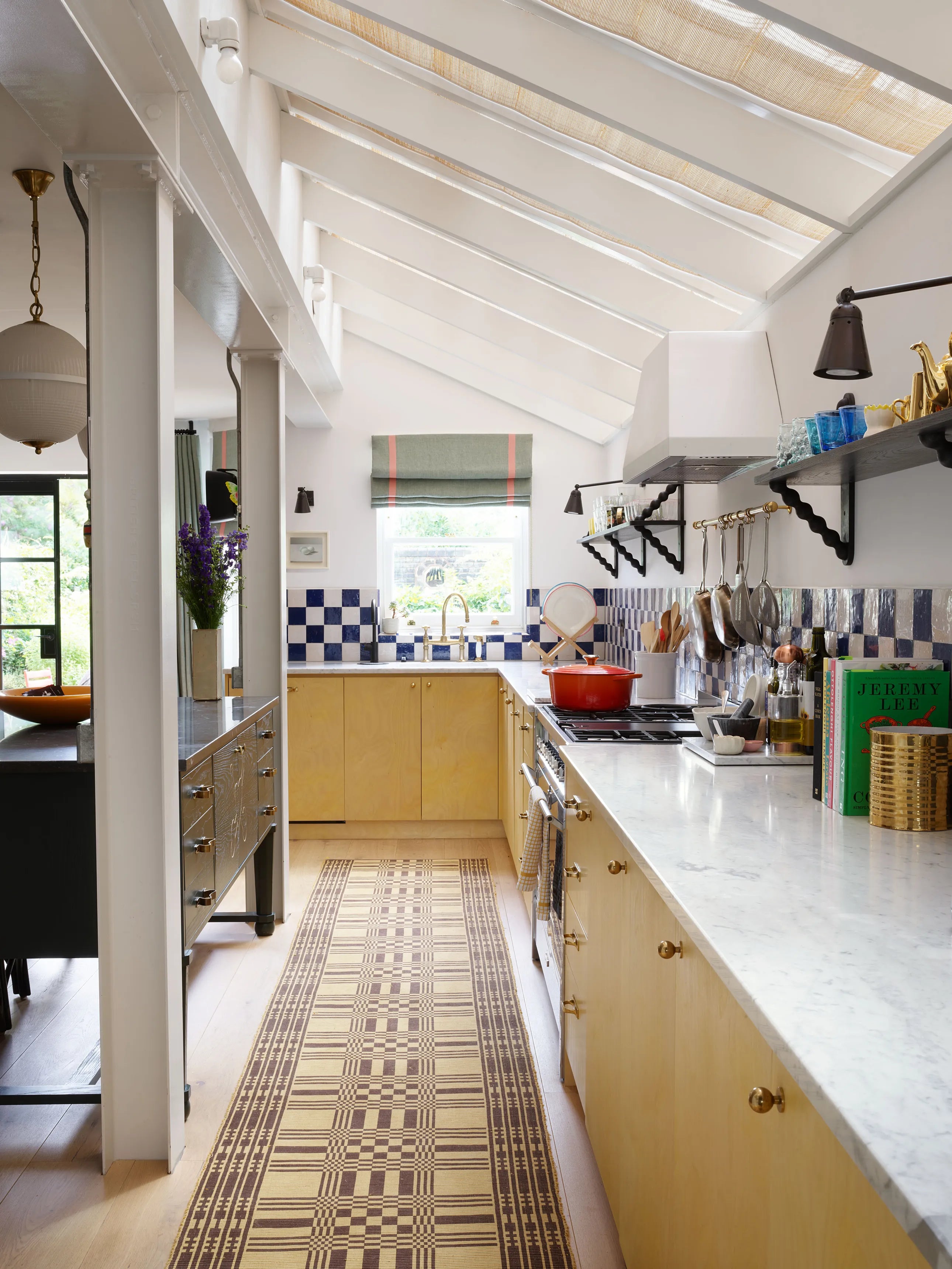 The birch ply kitchen was stained yellow enhancing the natural tones of the wood (it took 5 samples to find the perfect tone). We did a bold, chequered back-splash to counterbalance the softness of the cabinets. Rather than having top cabinets we used open bobbin shelves that provide storage without blocking any light coming from above.