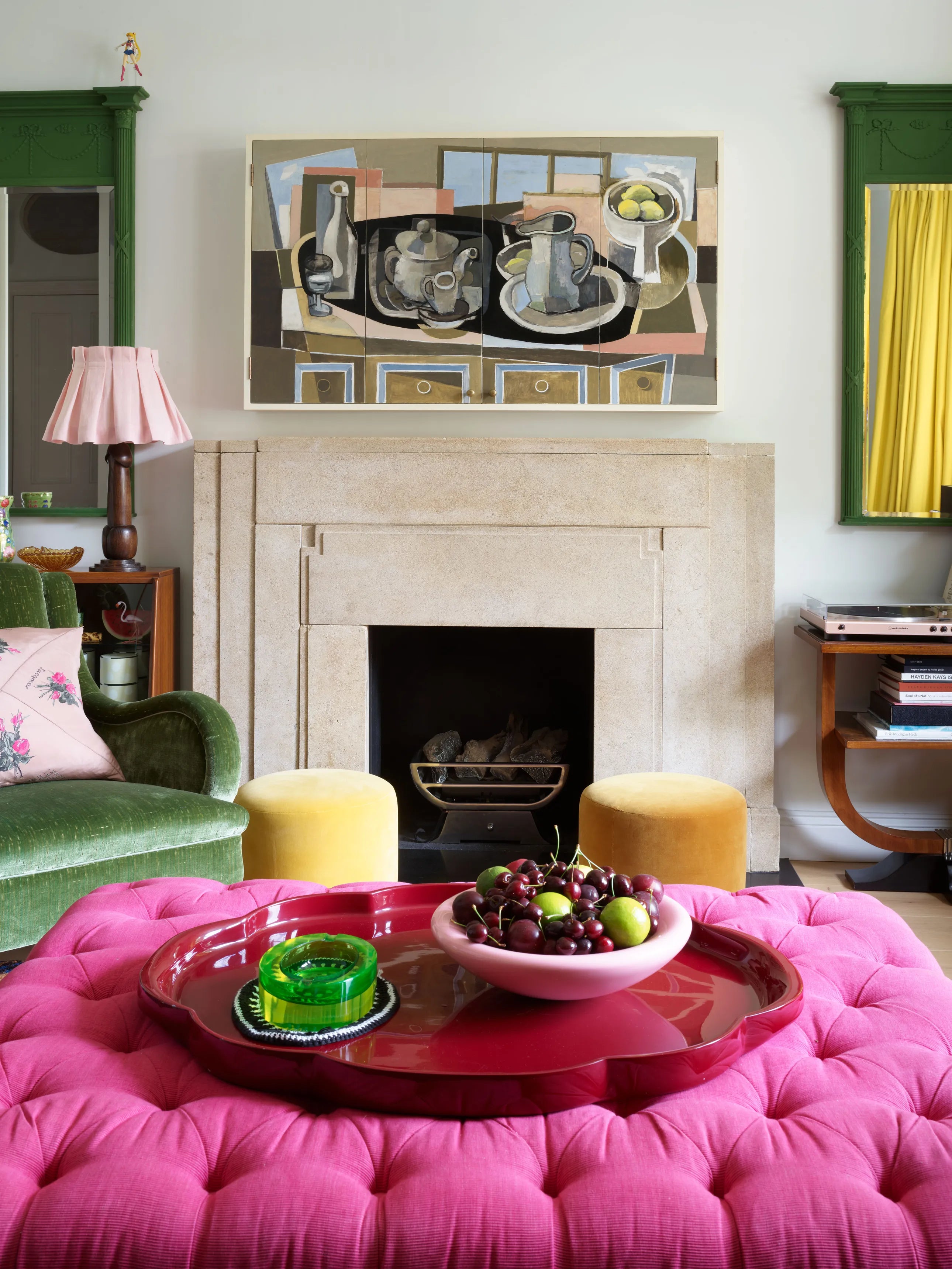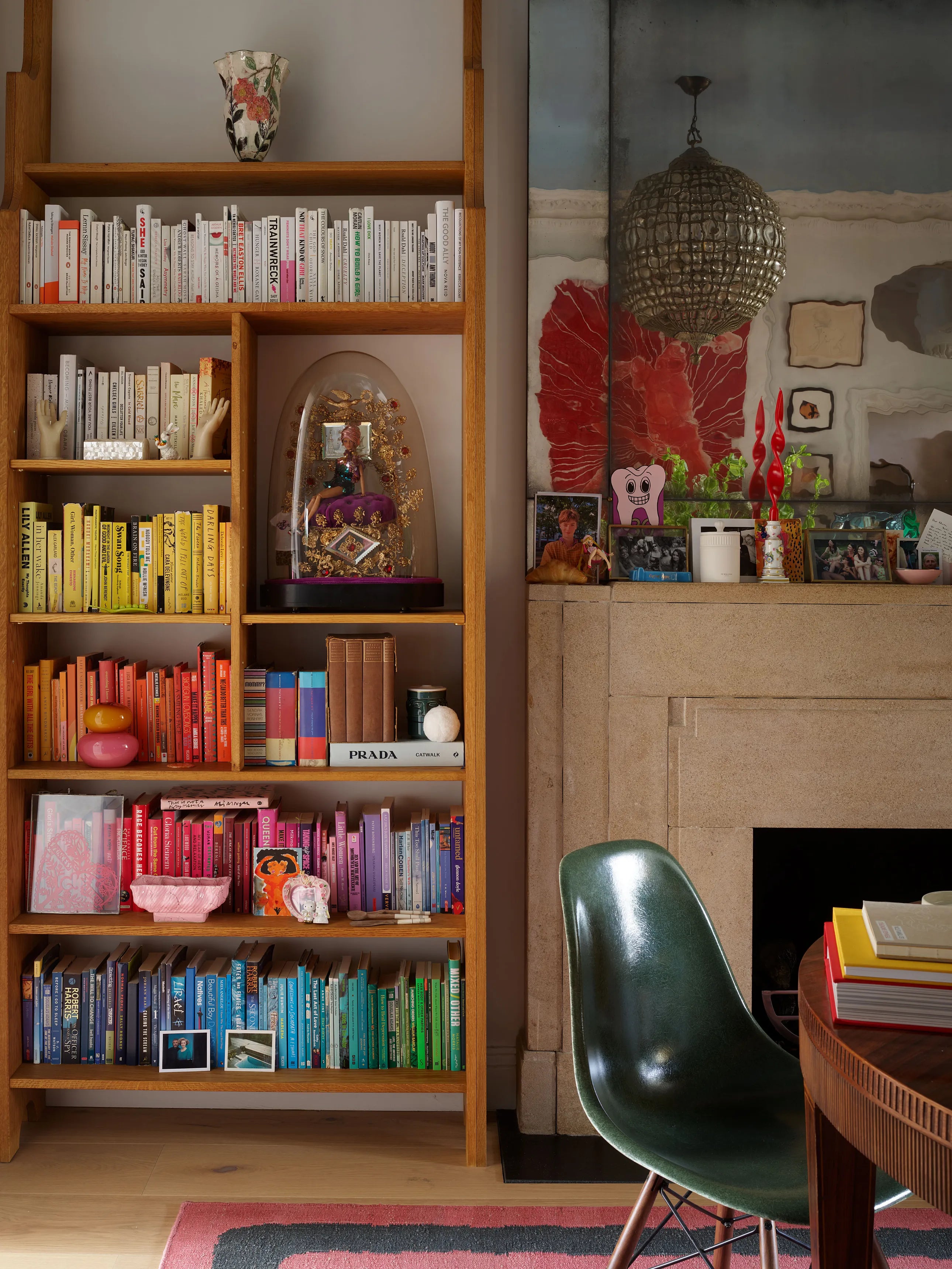 The library houses knick-knacks, photographs and collected books. A special place was prepared for Barbie Adwoa (right) in the bespoke bookshelves. A pair of antique Deco fireplaces were bought to take centre stage here and in the living room next to the library. The undulating mirror glass above contributes to a dreamy atmosphere.