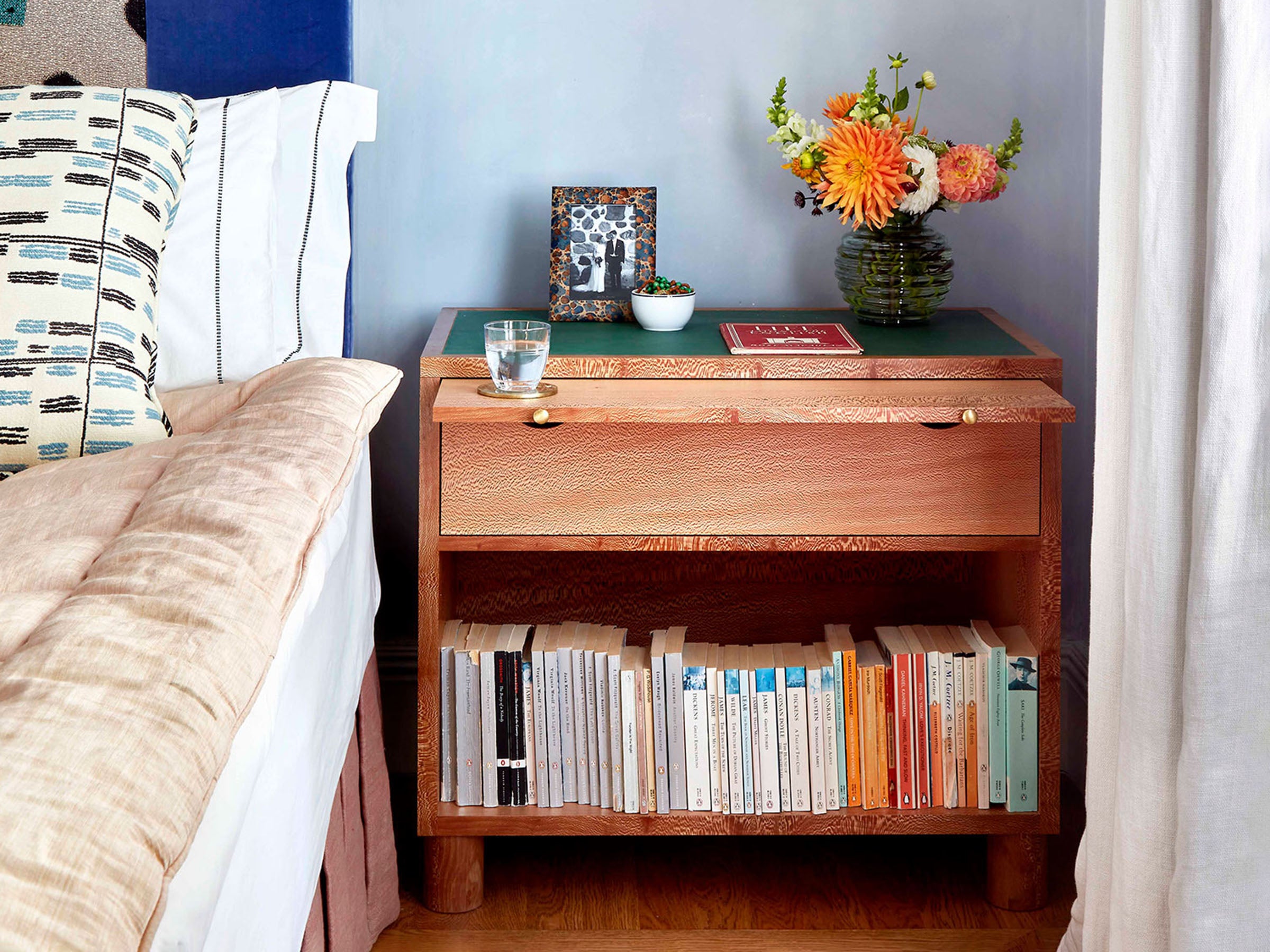These bedsides were first designed for a London bedroom and are made out of London plane, which is the most common tree growing in the capital since the 1600s. The wood has a varied and distinct flecked pattern, enhanced using natural wax oil, which is celebrated in this design and makes each bedside unique. The pull out shelf has a solid brass knob made by our bronzista in Florence and is perfect for when you need an extra surface for your water glass at night. The soft closing drawer has an ergonomic cut out handle, which also works well as an opening for a charger cable. There is plenty of space for books on the bottom shelf, which sits lightly atop the bedside's cylindrical feet. The top of the bedside has an ethically sourced vegetable tanned leather insert which has been finished with a natural wax. It will develop a beautiful patina over time. Other leather colours are available on request. This design is also available in a small size. Made in the UK.