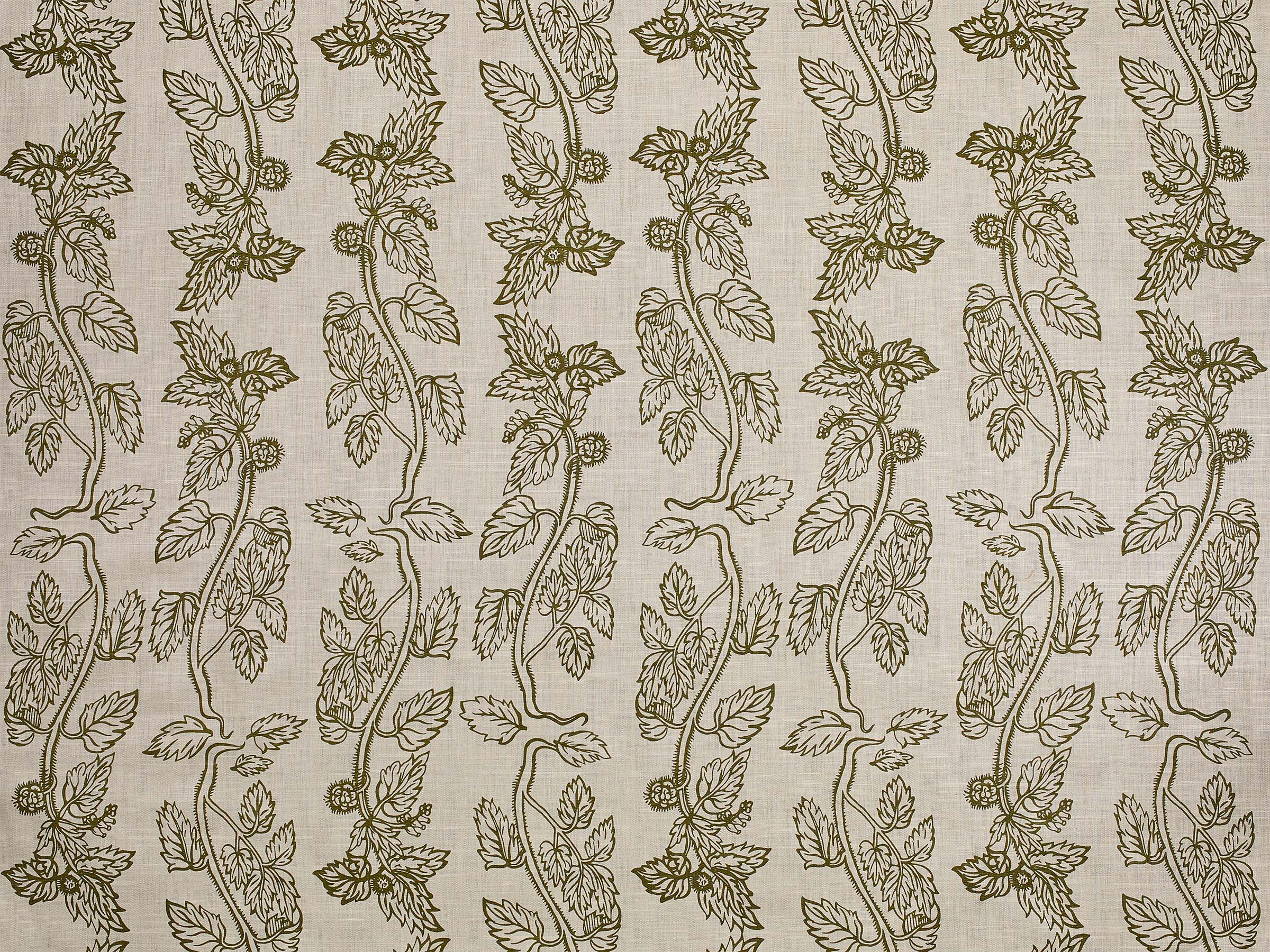 Nettle Bone was inspired by a 16th century botanical print depicting the humble weed, which we re-imagined and transformed into a large, scrolling pattern. The fabric is screen printed in England using a bronze-green pigment on a cloth with a yellowy hue that gives it a rich, soothing warmth. The back cloth is an Irish linen that has been through four finishing processes to create a beautiful drape, soft handle and subtle sheen.