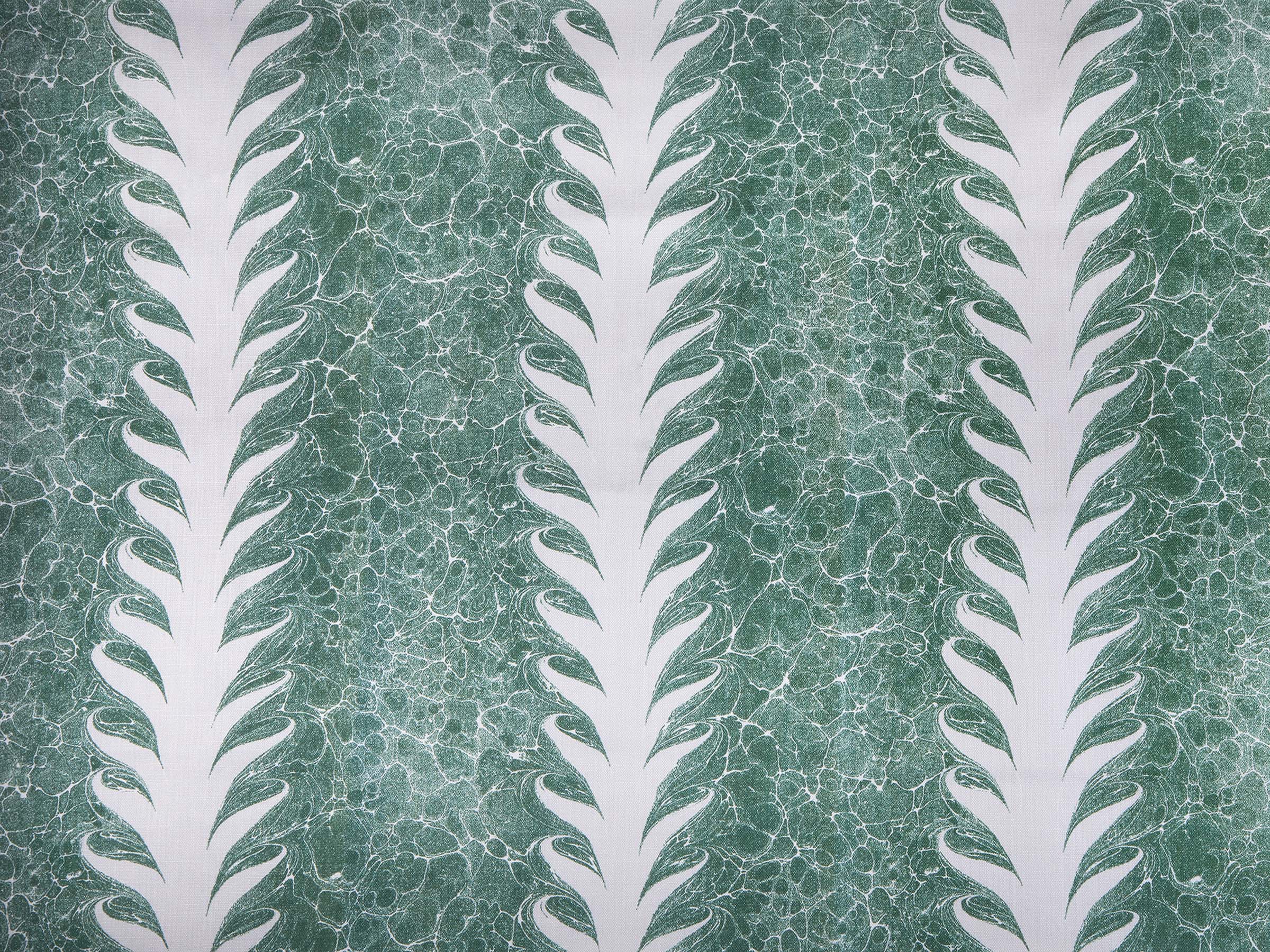A wild, yet elegant stripe in a selection of colours inspired by the 19th Century art of Marbling. The pattern is digitally printed onto a simple basecloth to keep the fabric appropriate for everyday contexts. The Sea Green/Chalk colourway and its marbling lines are reminiscent of emerald green seas. Available in two other colours: Squid Ink/Brick and Sky Blue/Plaster.