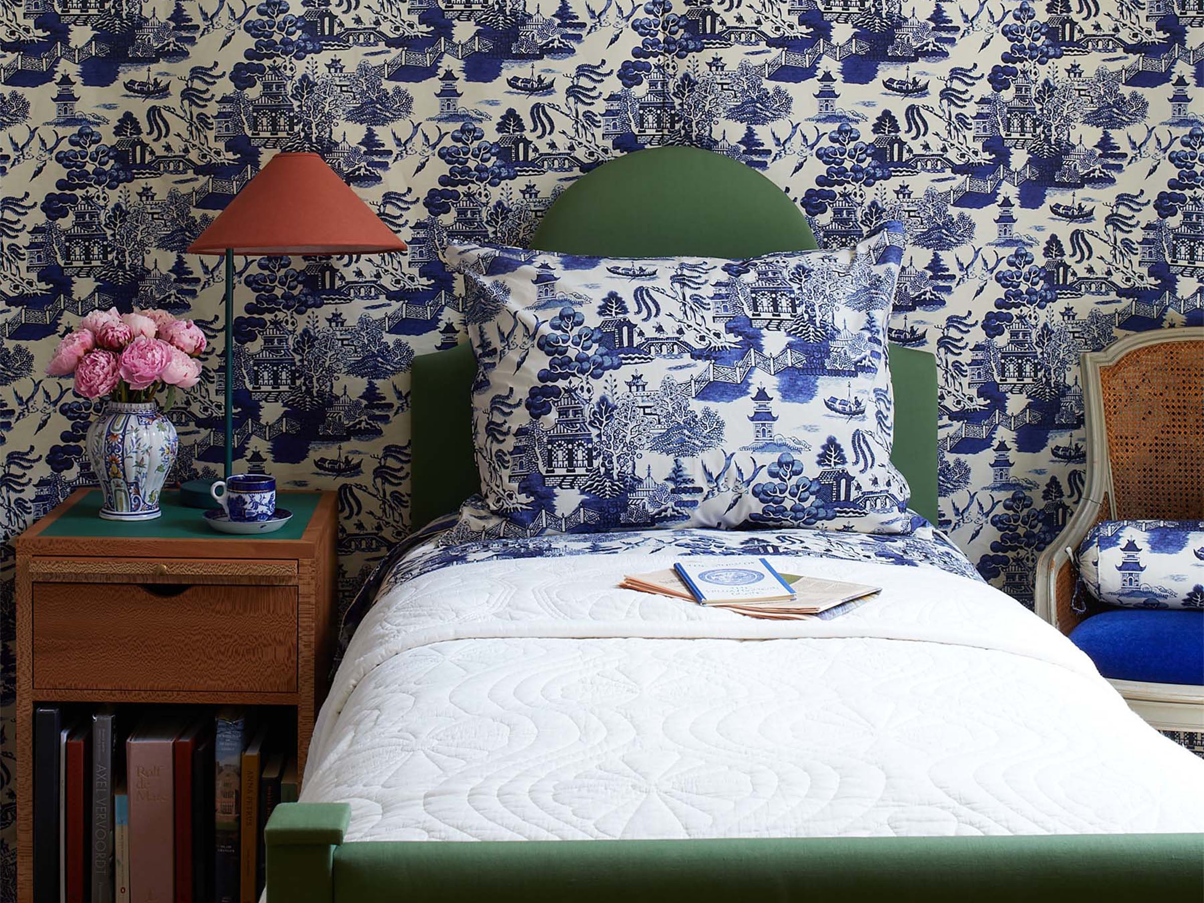 Willow is inspired by the distinctive chinoiserie pattern adapted and popularised in the 18th century. This pattern is based on an antique plate bought on holiday in Cornwall, which we developed into a larger scale repeat. Pictured here at home in Sweden with our matching Willow Ink fabric. Going to bed here is like sleeping in a sugar bowl.