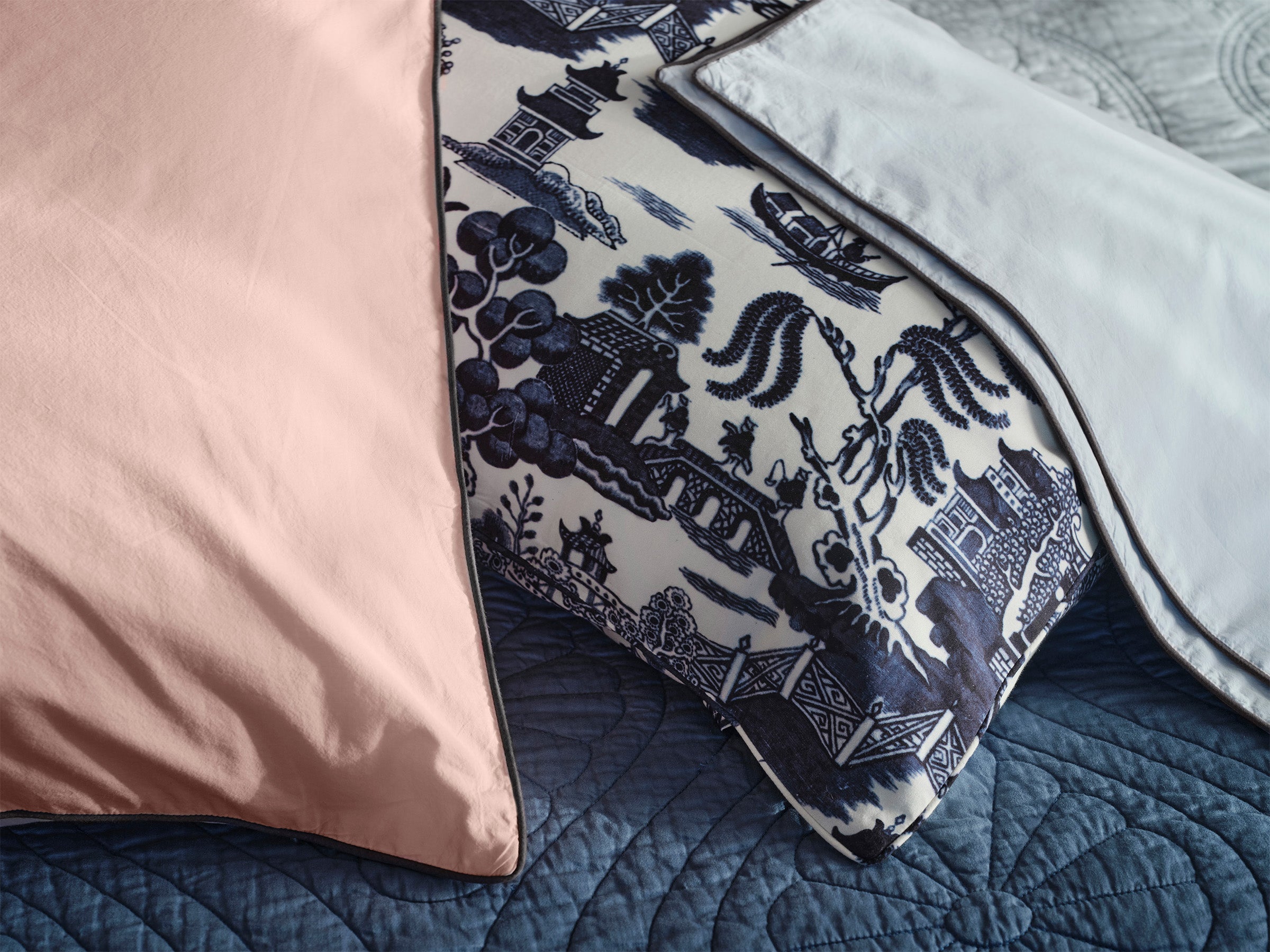 Willow is inspired by the distinctive chinoiserie pattern adapted and popularised in the 18th century. This pattern is based on an antique plate bought on holiday in Cornwall, which we developed into a larger scale repeat. Pictured at home in Sweden with our matching Willow Ink fabric. Going to bed here is like sleeping in a sugar bowl.